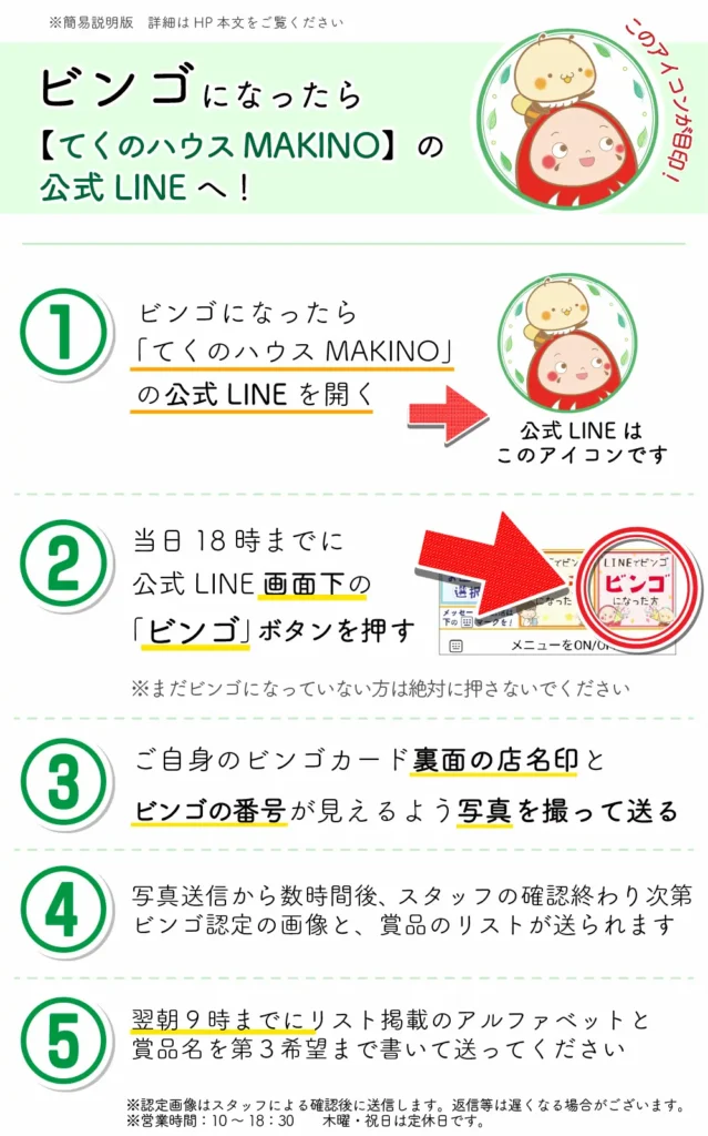⚠️ 当日18時まで下の画像等の手順で必ずてくのハウス公式LINEへビンゴ申請