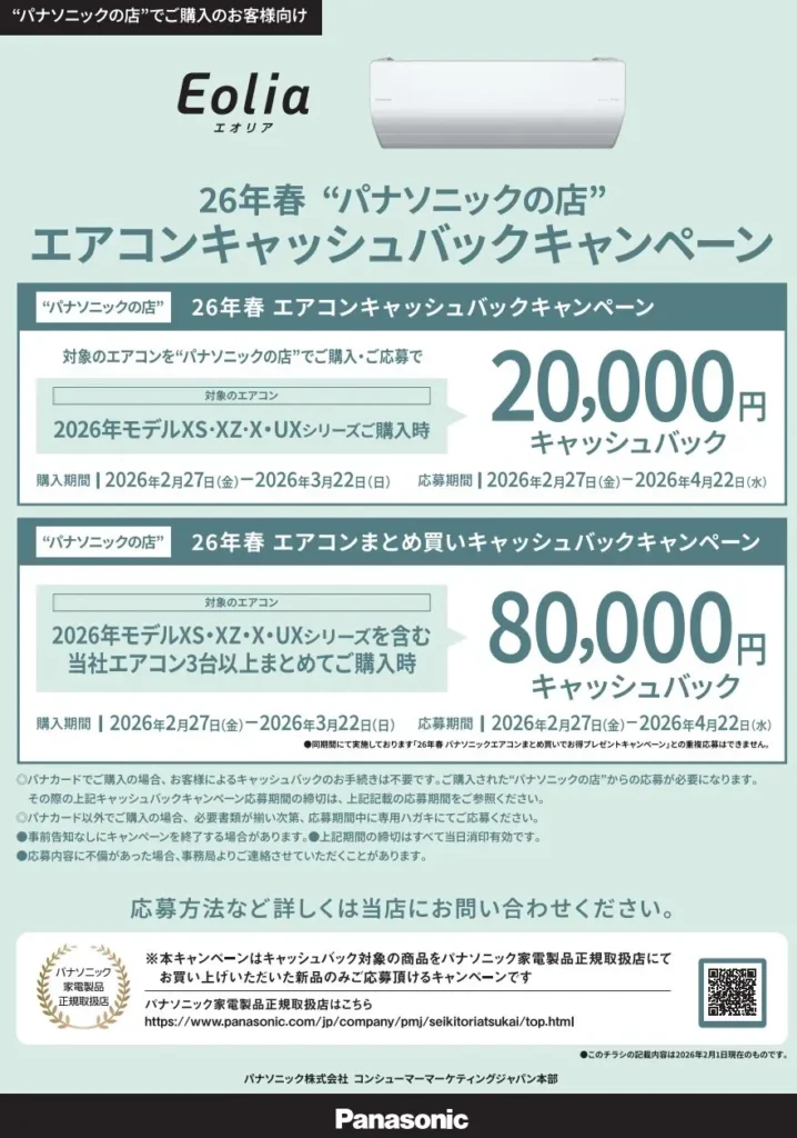 対象のPanasonicエアコン、キャッシュバックキャンペーン実施中です✨